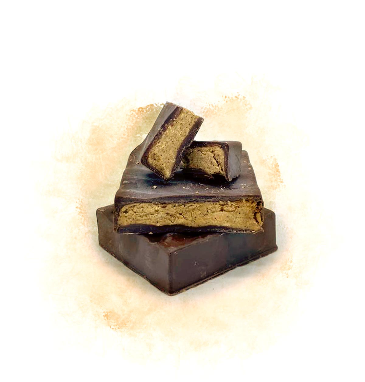 -TURRÓN DE ALMENDRAS: delicioso turrón de chocolate del 55% relleno de una deliciosa pasta de almendras y almendras seleccionadas. Toda la tradición en tu paladar.