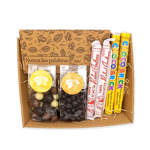 Cesta mediana choco-mensaje: 1 tableta choco-mensaje, 2 delicias en bolsa, 2 bollets y 2 choco-leche
